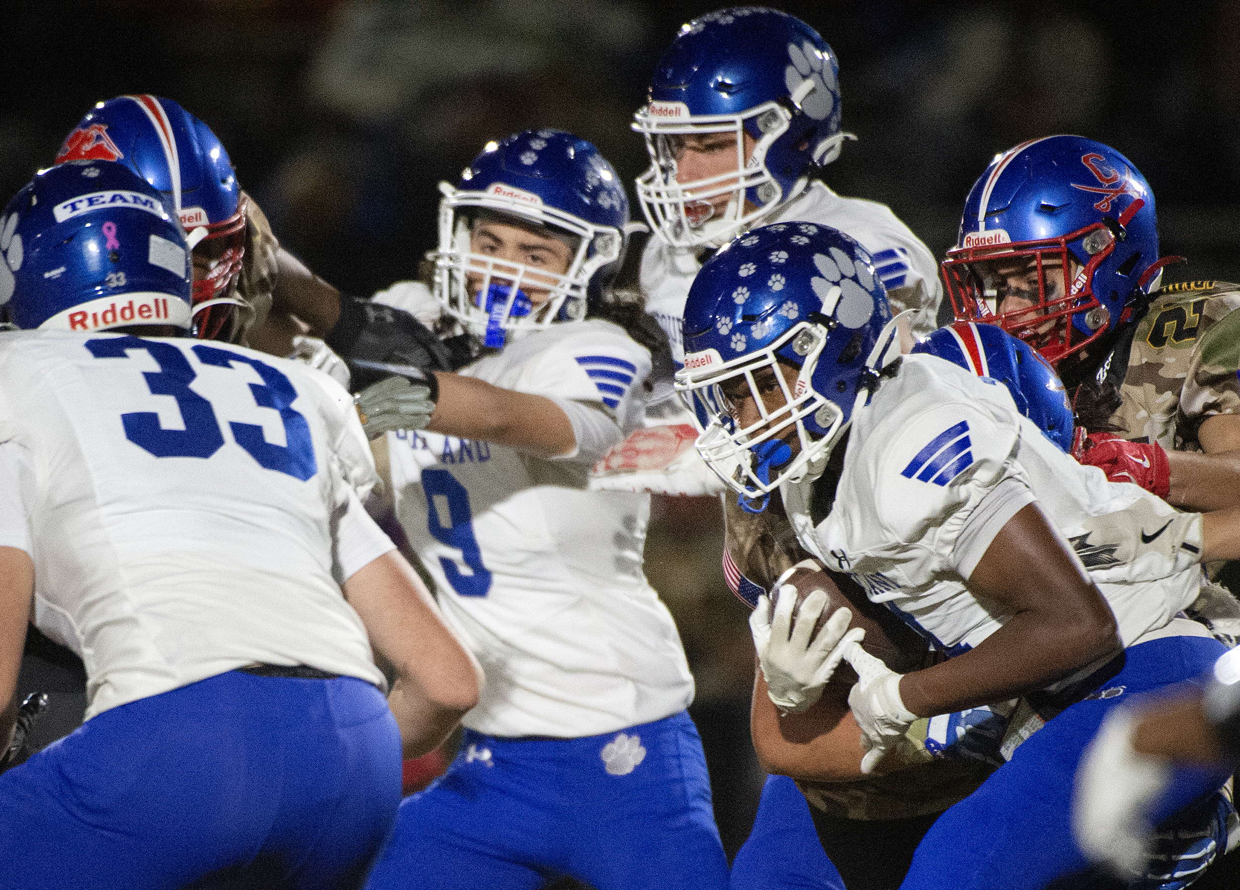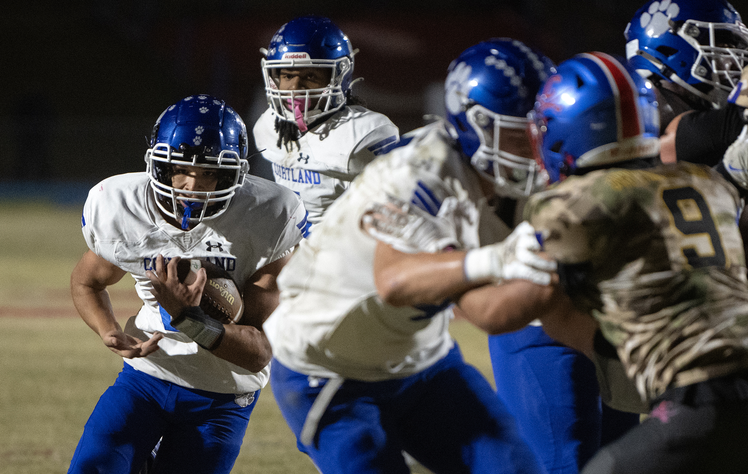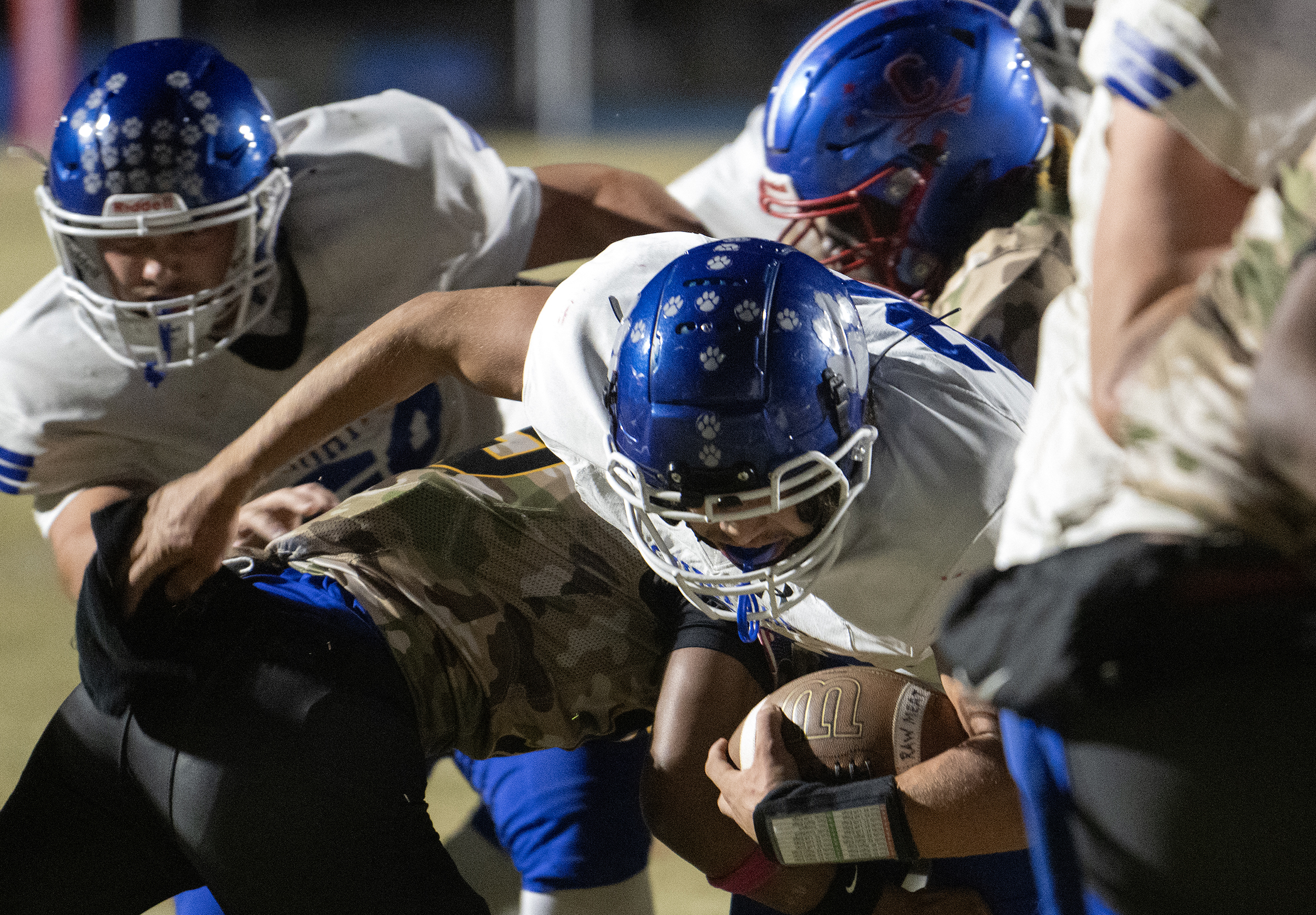Caught between Cavalier defenders, Courtland’s Tyrik Newman (29) keeps his head down and momentum forward as the Cougars defeat Caroline Friday October 24, 2025. Photo by Jeff Kearney.