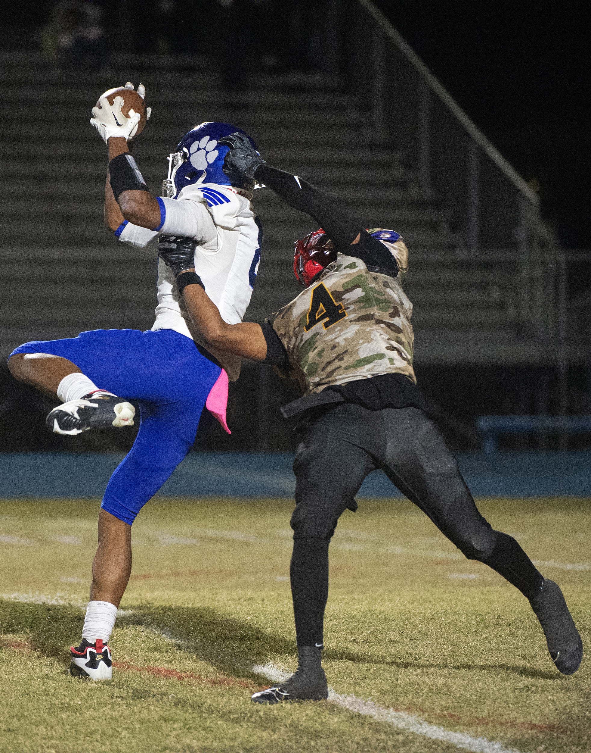 As Cougar Ahmari Boxley (8) lands on one foot after catching the ball, Cavalier Blair Morris (4) bends over backwards to try and breakup the reception during Caroline’s 28 to 21 loss to Courtland Friday October 24, 2025. Photo by Jeff Kearney.