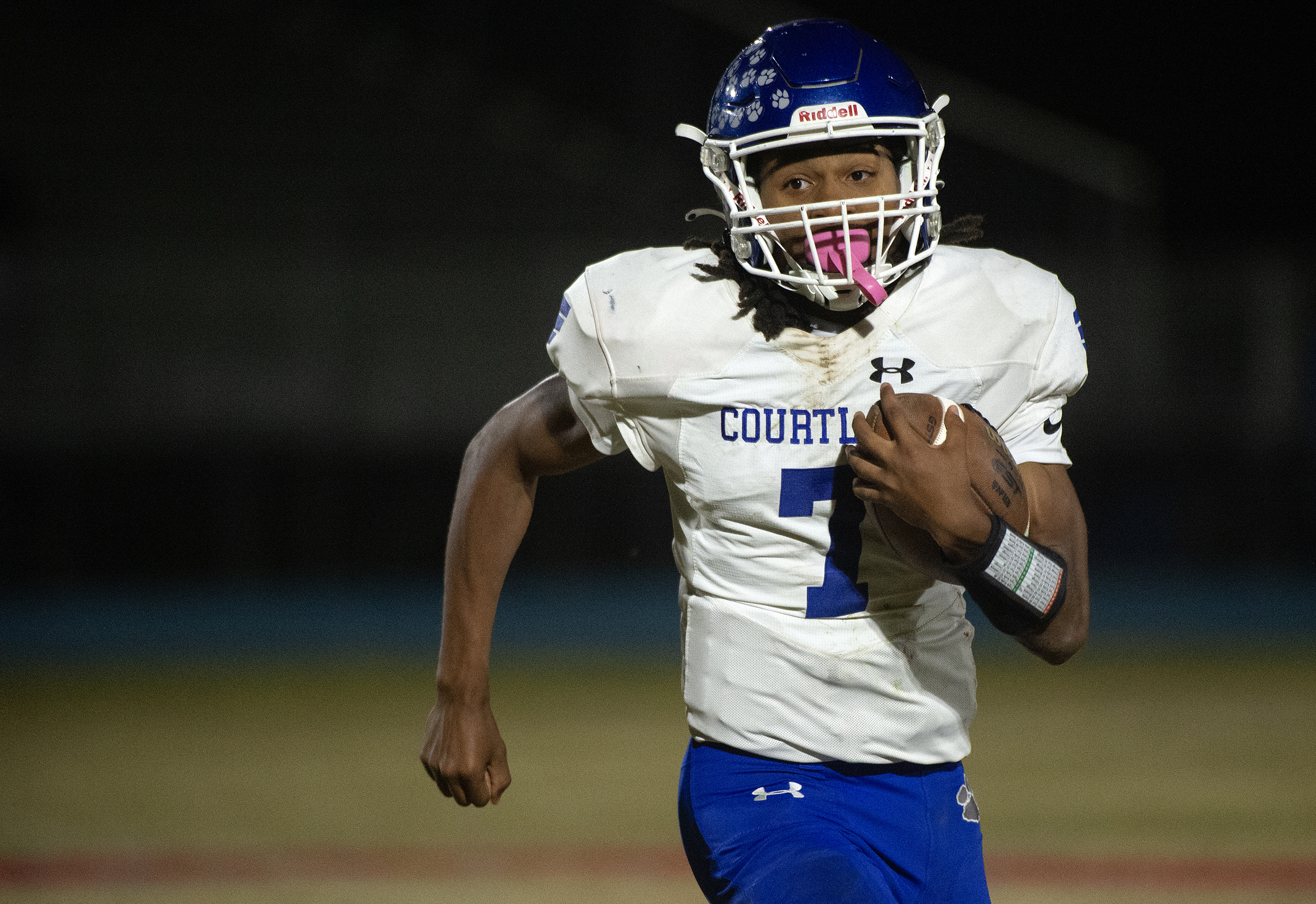 Cougar Tyrik Newman (29) makes his way towards the opening in the Cavalier line during Courtland’s win over Caroline Friday October 24, 2025. Photo by Jeff Kearney.