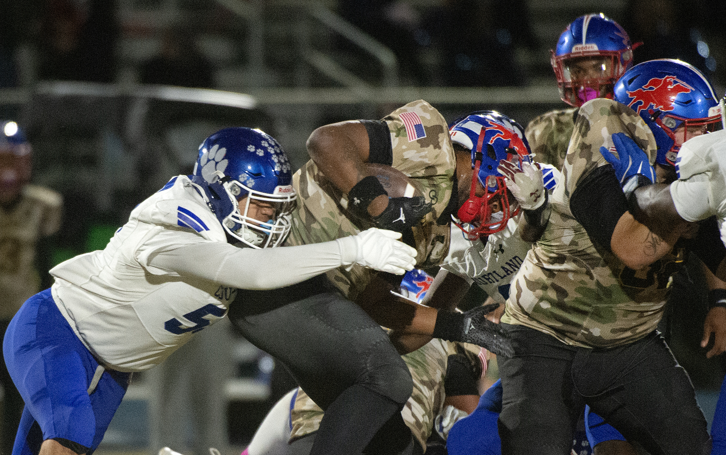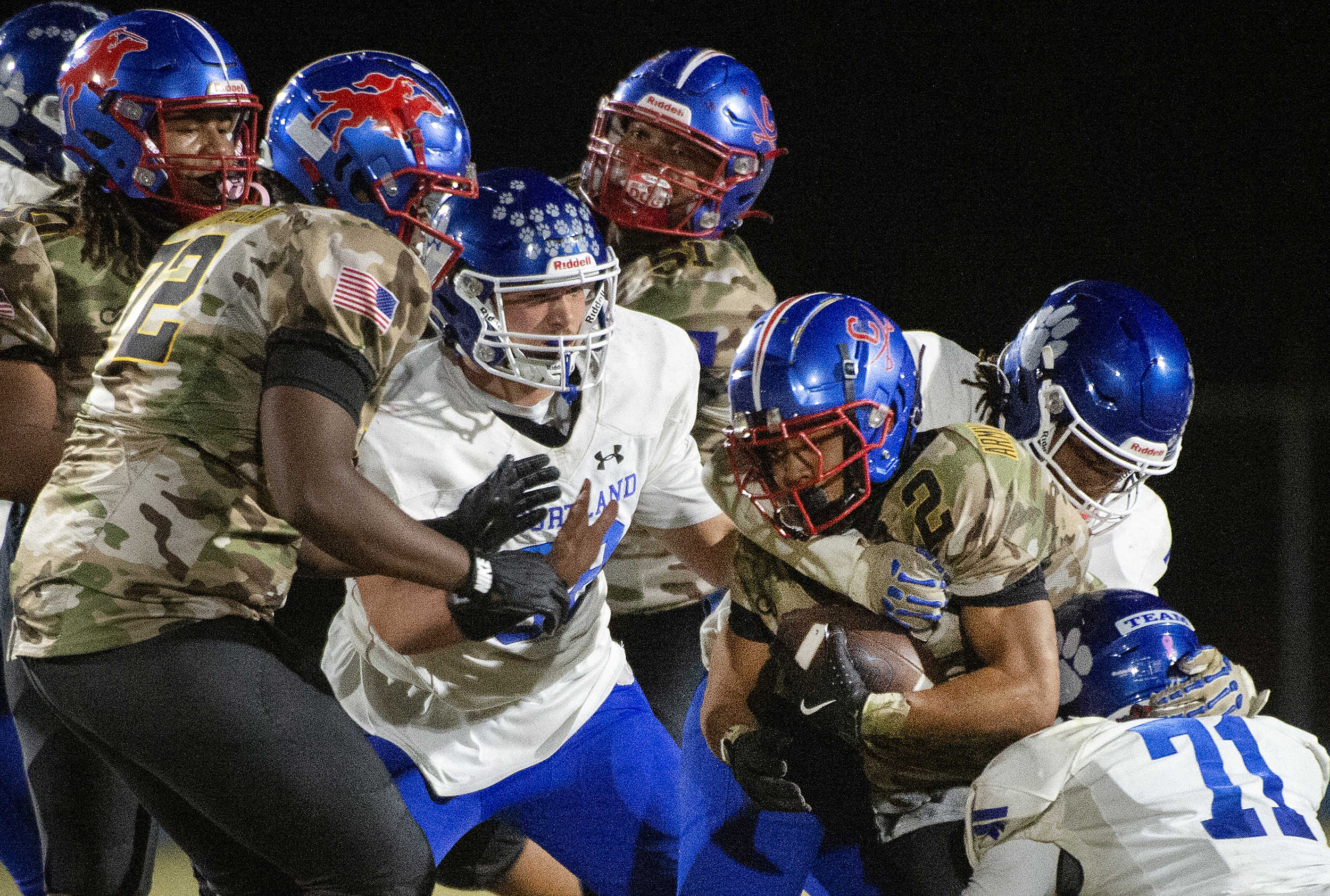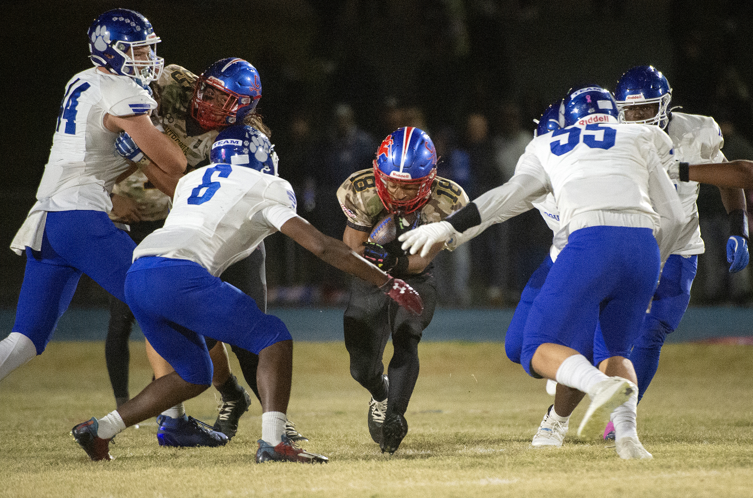 Cougar defensive players sink their claws into Cavalier Trejour Coles (5) during Caroline’s loss to Courtland Friday October 24, 2025. Photo by Jeff Kearney.