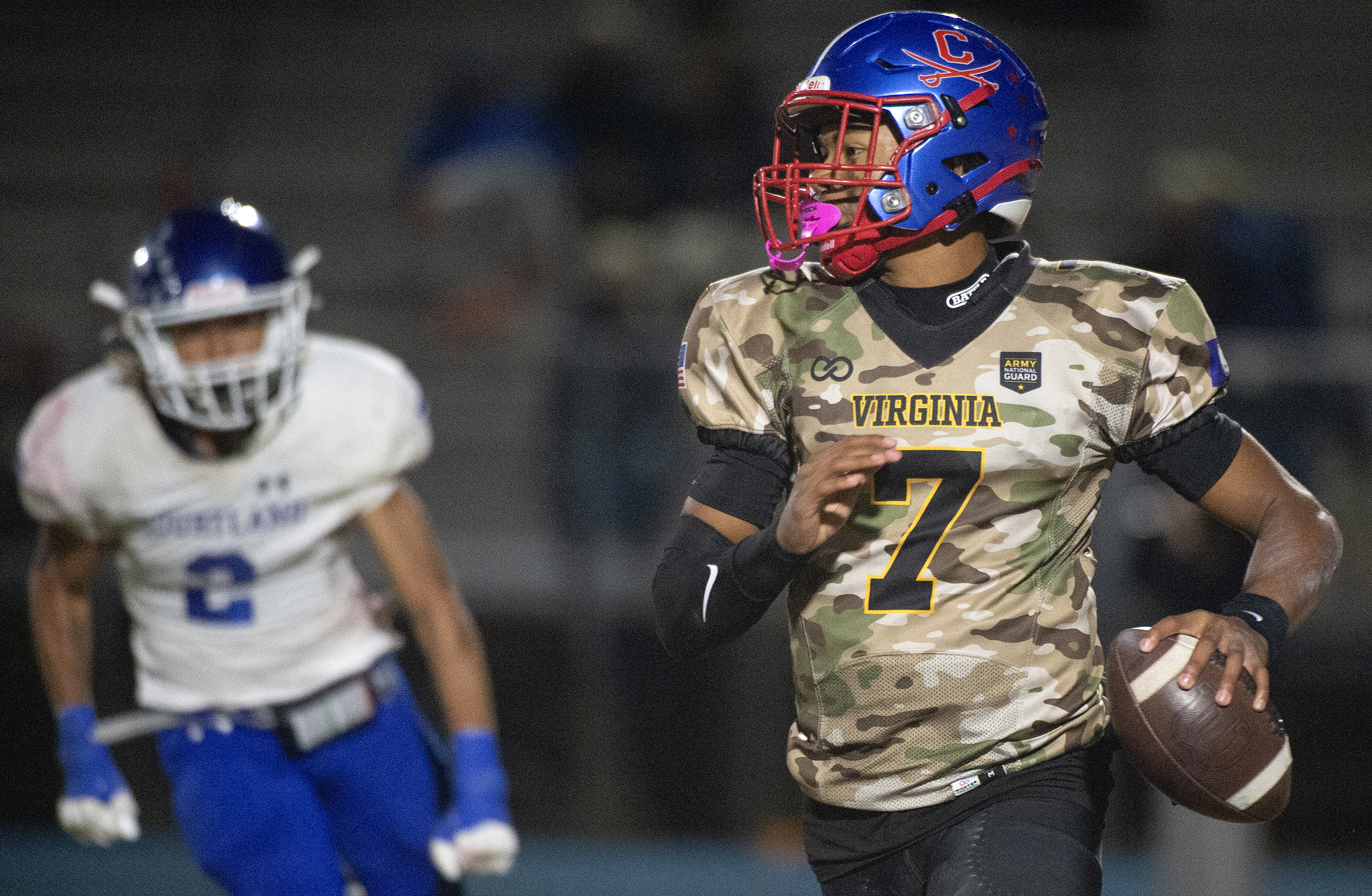 Courtland QB Chieftan Watson (7) breaks into an open field run against the Cavaliers as the Cougars defeat Caroline 28 to 21 Friday October 24, 2025. Photo by Jeff Kearney.