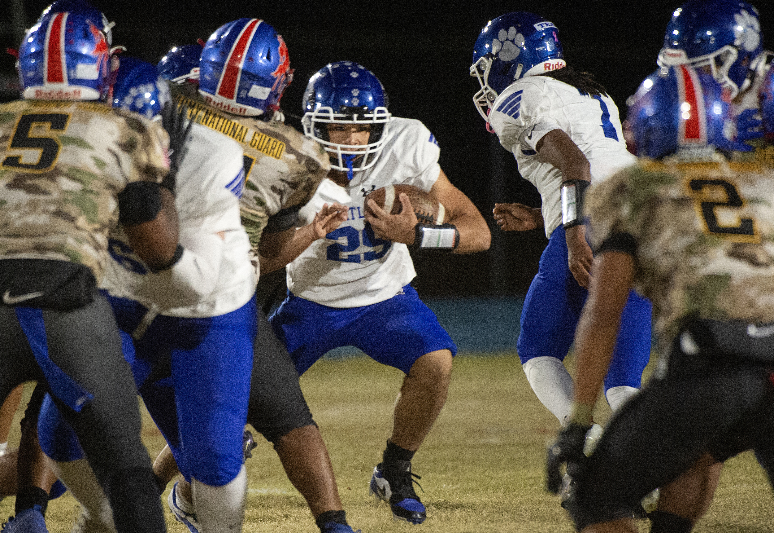 Cougar Tyrik Newman (29) continues his multiple drives towards the end zone against the Cavalier defense during Courtland’s 28 to 21 victory over Caroline Friday October 24, 2025. Photo by Jeff Kearney.