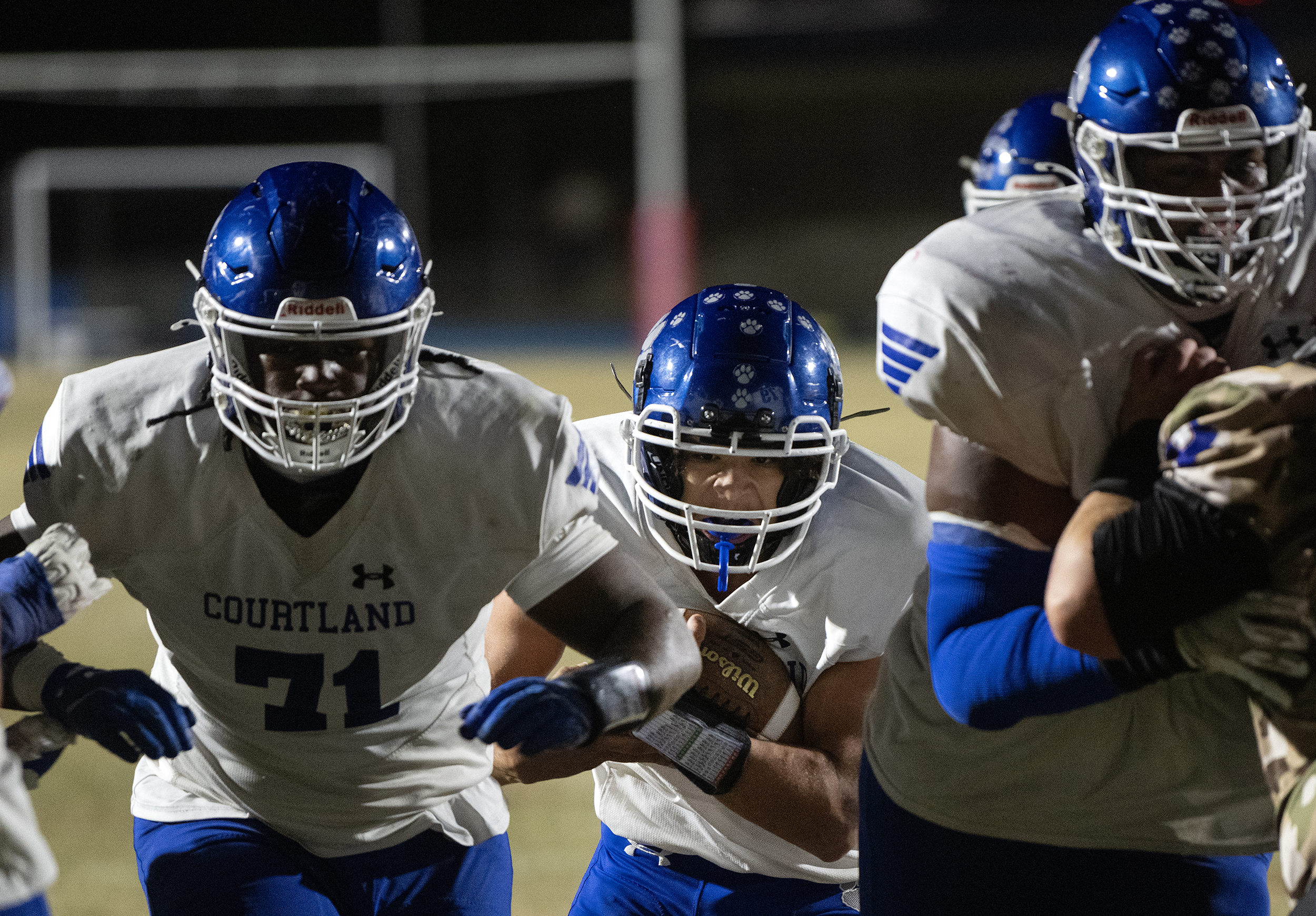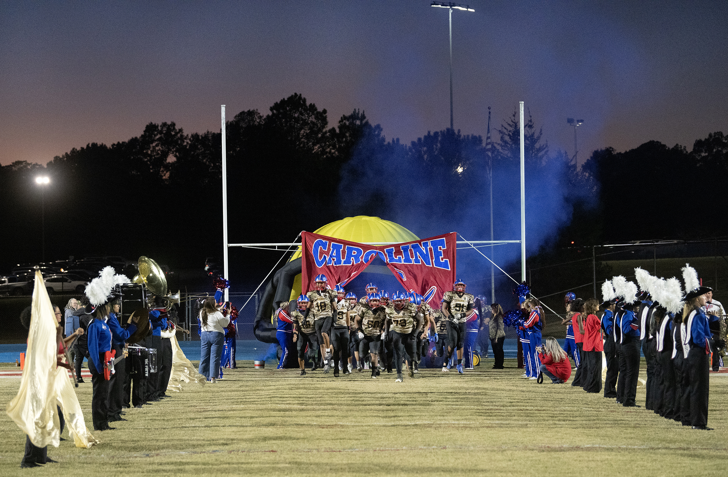 The Caroline Cavaliers take the field against the Courtland Cougars Friday October 24, 2025. Photo by Jeff Kearney.