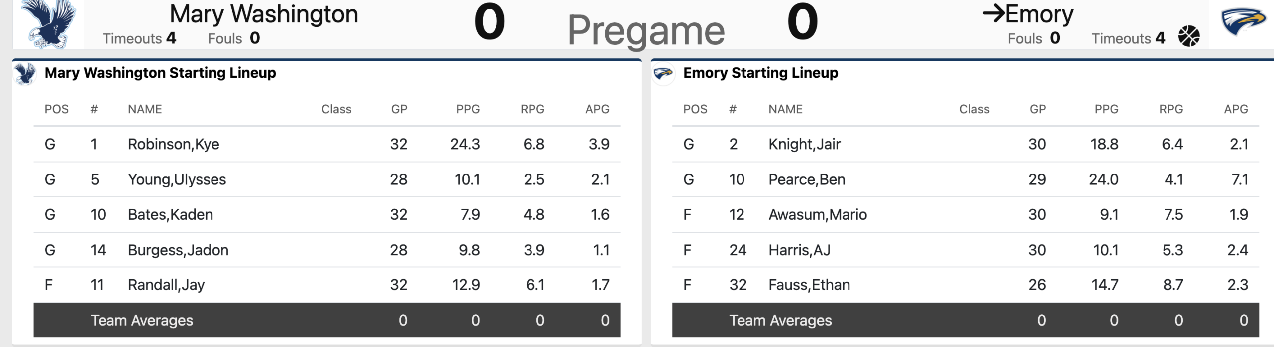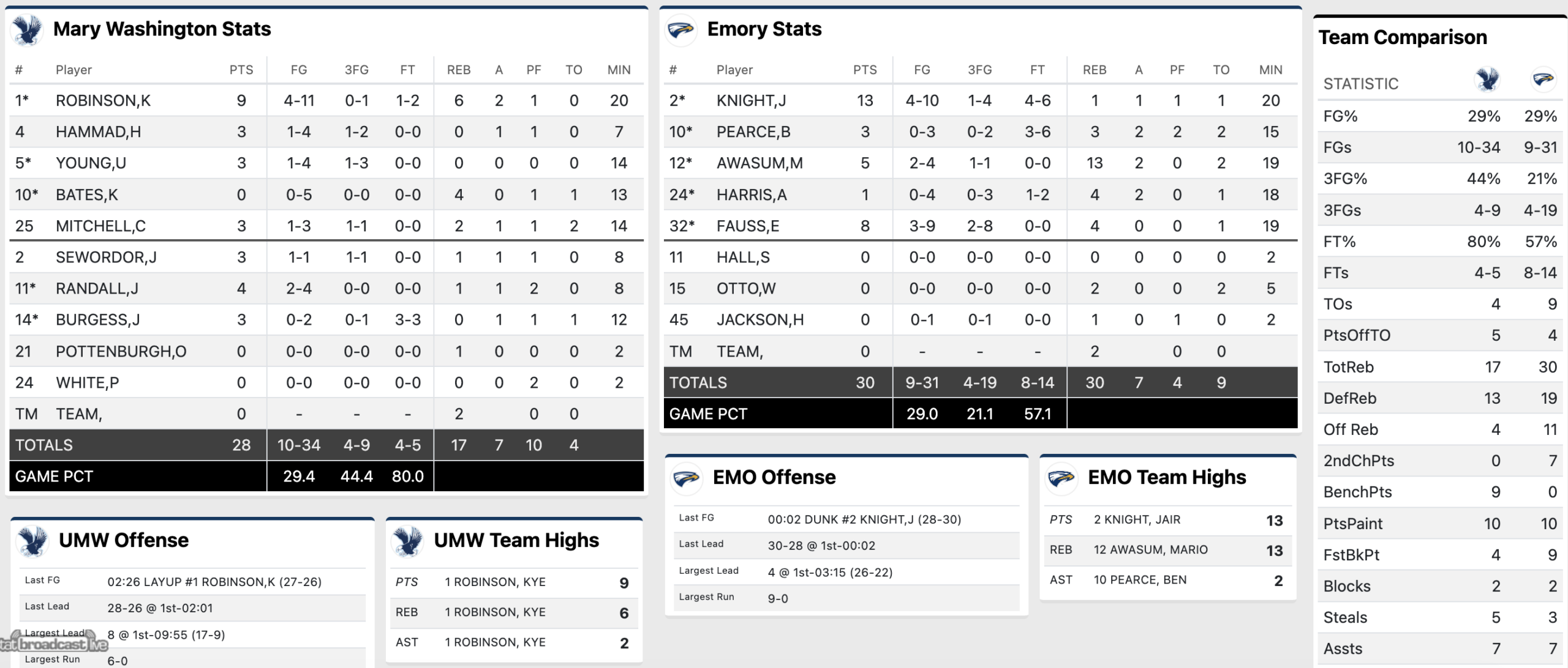 Halftime: Emory 30, UMW 28. Potentially a momentum-shifting one-handed slam by Jair Knight to end the first 20 minutes of play. Kye Robinson had nine points and six boards to lead UMW. Knight with 13 points for Emory. Both teams shooting 29 percent from the field.