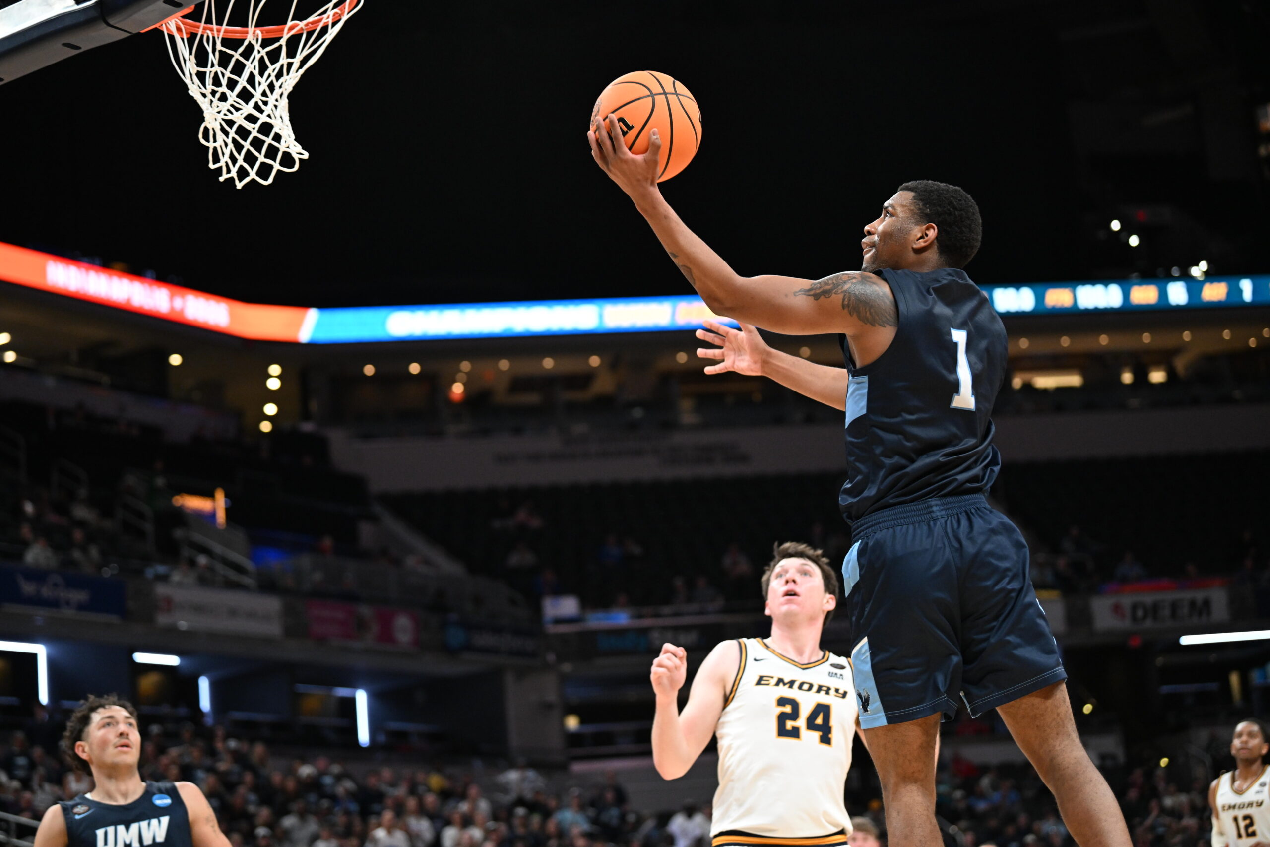 Halftime: Emory 30, UMW 28. Potentially a momentum-shifting one-handed slam by Jair Knight to end the first 20 minutes of play. Kye Robinson had nine points and six boards to lead UMW. Knight with 13 points for Emory. Both teams shooting 29 percent from the field.
