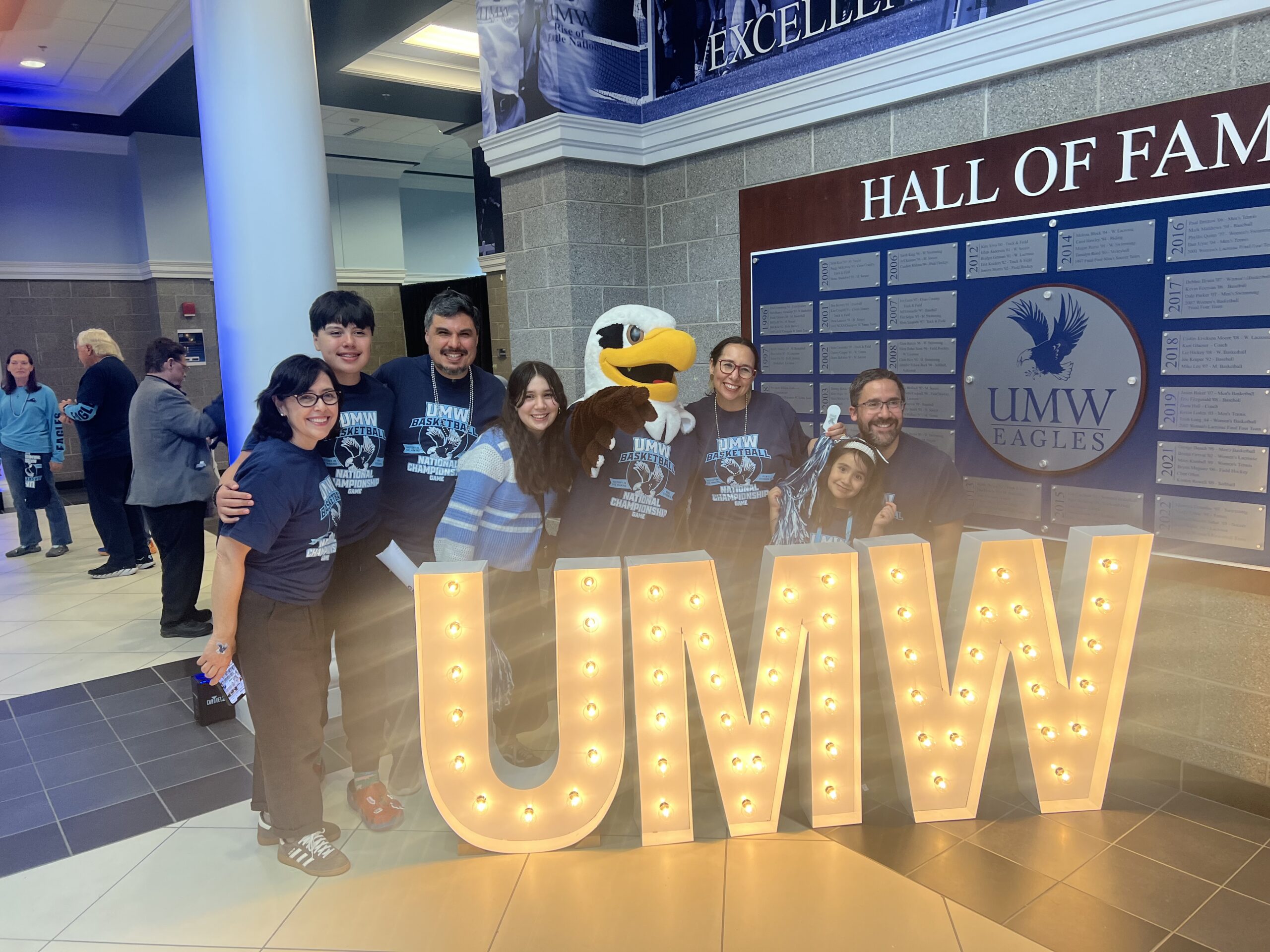 Fans were able to take photos with UMW mascot Sammy D. Eagle on Sunday. From left to right here are: Pia Sanchez, Matias Sanchez, Javier Sanchez, Amanda Campos, Laura Campos, Valentina Campos, and Gonzalo Campos.