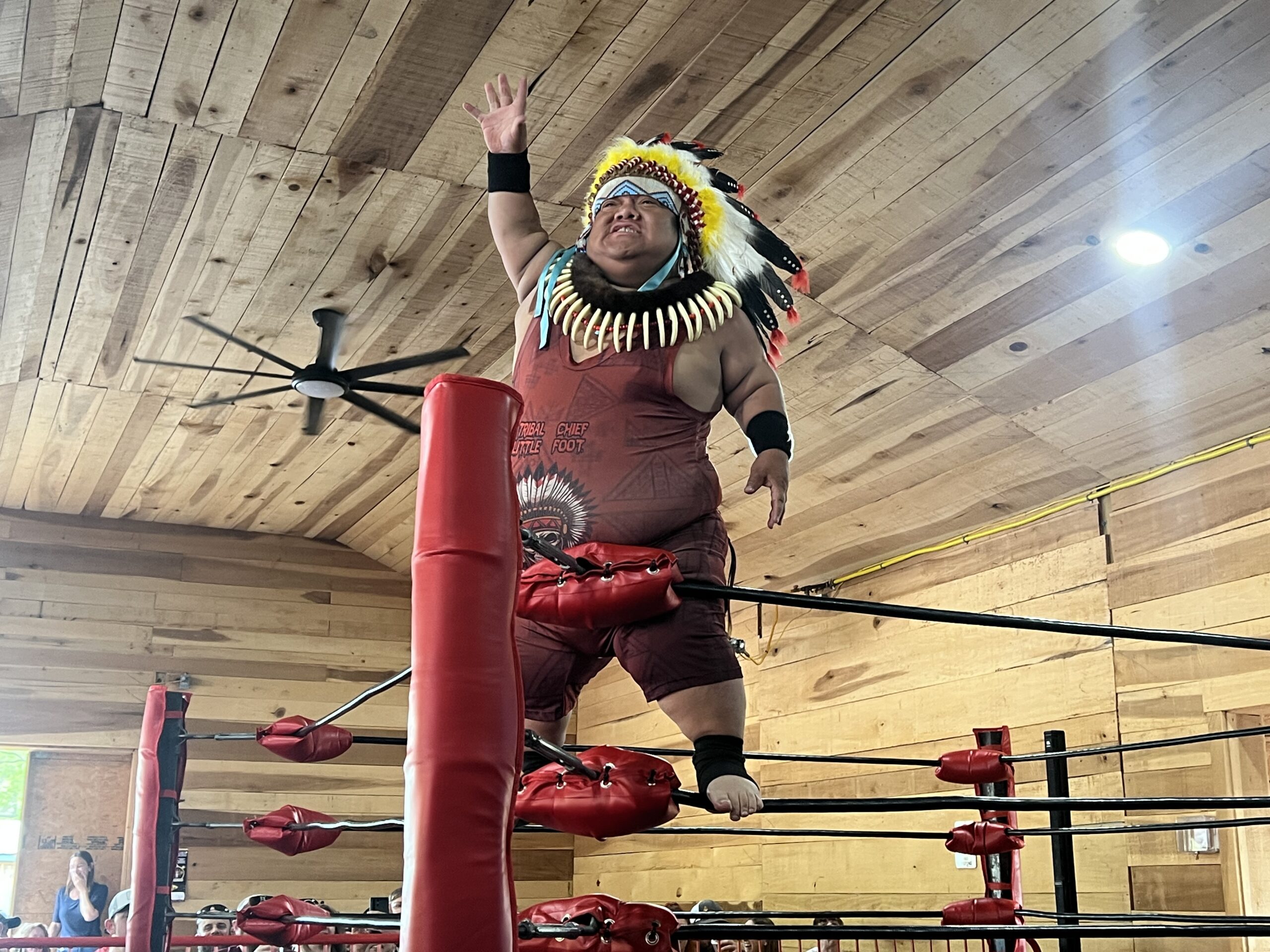 Chief Little Foot of the Micro Wrestling Federation greets the crowd Sunday at Log Home Brewing Co. in Spotsylvania County. The in-ring persona of the “Tribal Chief” isn’t a gimmick. He’s a member of the Nakota Sioux tribe.