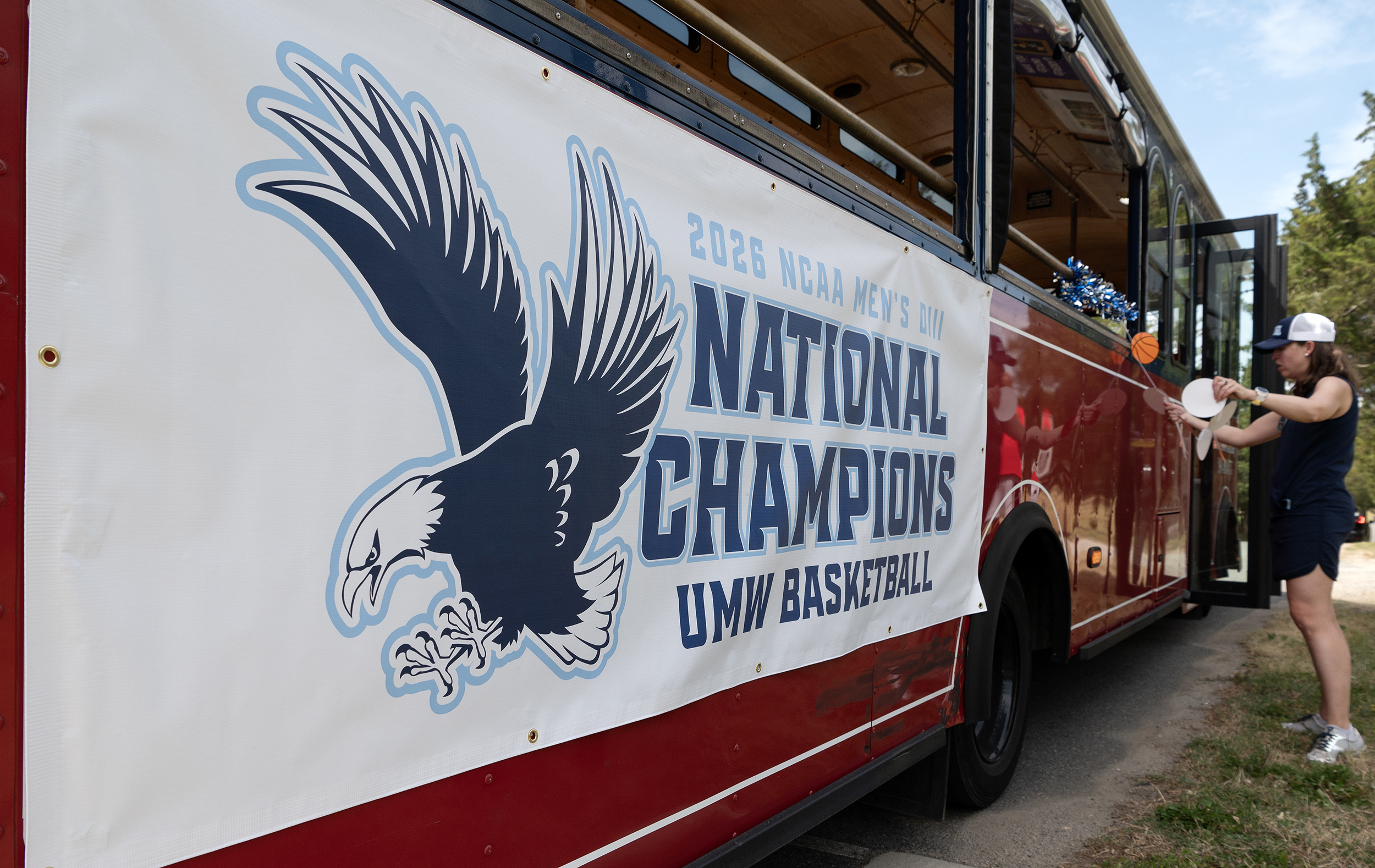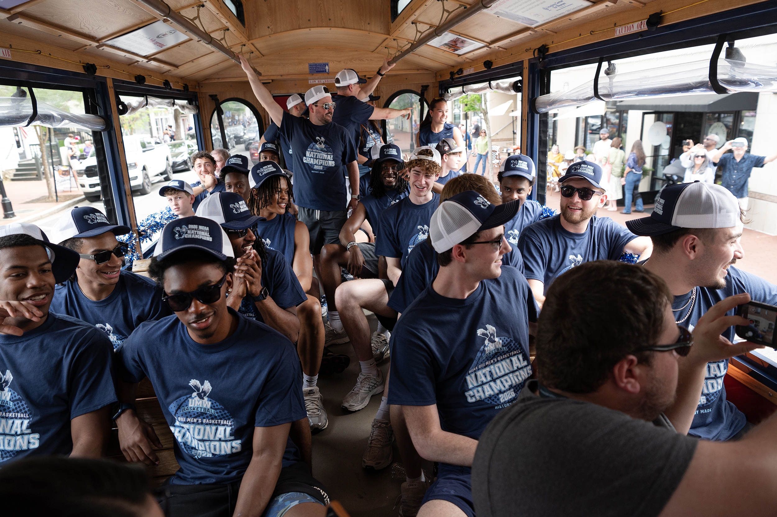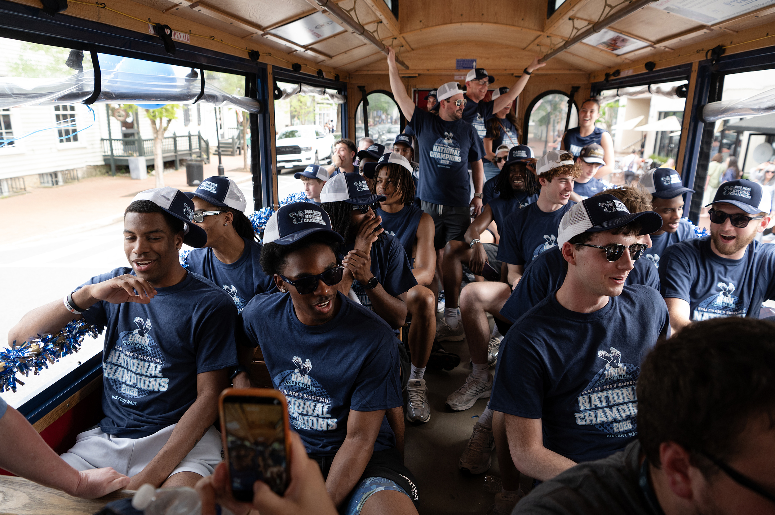 The UMW mens basketball team paraded through town on a trolley.