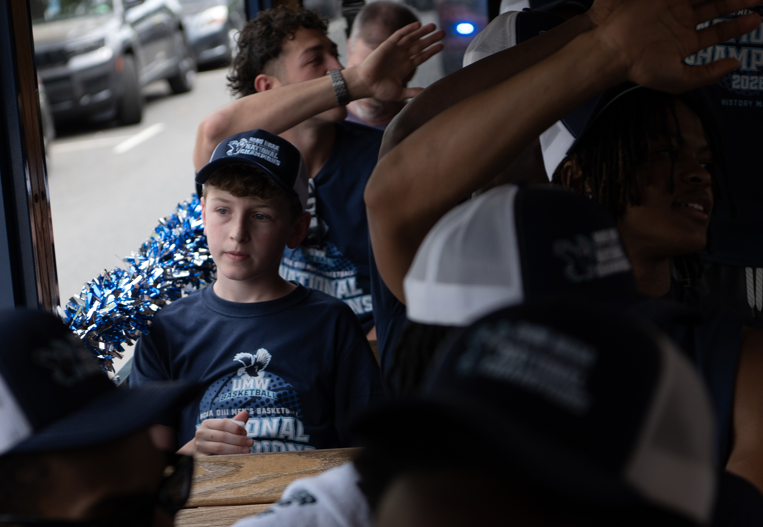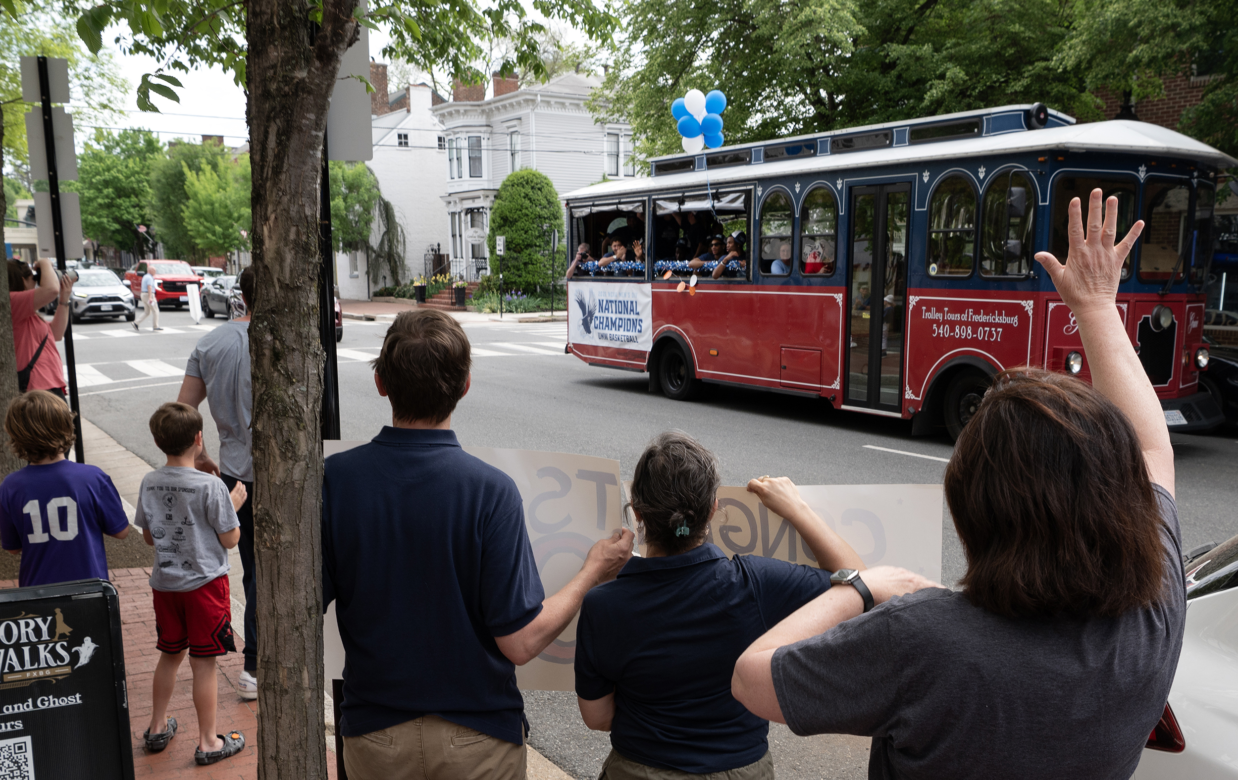Fans wave to a trolley carrying members of UMW’s men’s basketball team.