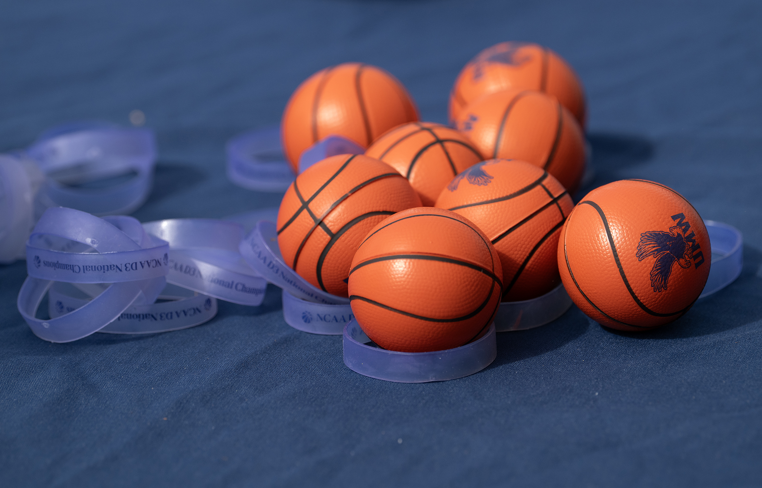 UMW’s Hasan Hammad carries a segment of net draped over the NCAA national championship trophy.