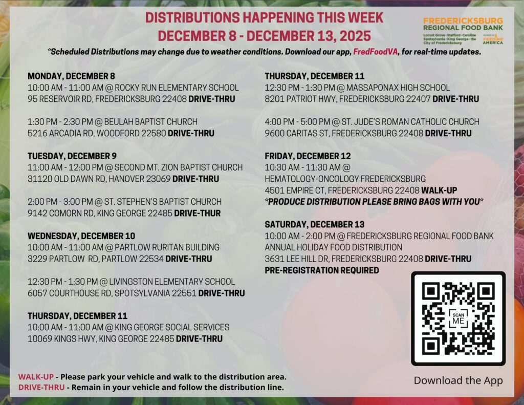 Full distribution details are available on the Food Bank’s Facebook Events Page or in the free FREDFOODVA app.