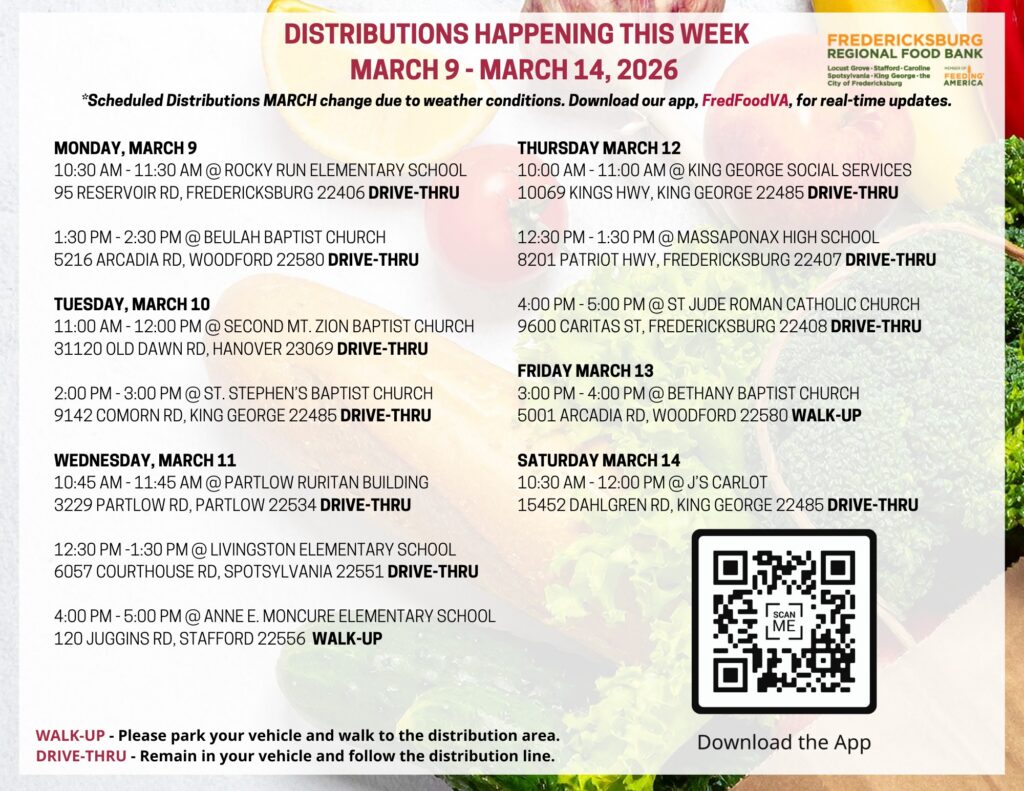 Fredericksburg Regional Food Bank distribution this week. Find full details on their Facebook Events Page or their free FREDFOODVA app.
