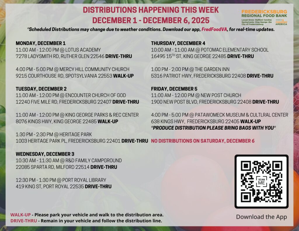 The Fredericksburg Regional Food Bank says residents can come once a week for Drive-Thru or Walk-Up distributions, no ID required—just a few quick questions to help staff serve everyone.